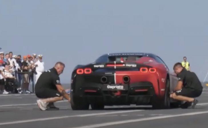 The choice of car mattered. The Ferrari SF90 is no ordinary machine. It packs nearly 1000 horsepower, launches from 0 to 100 km/h in just 2.5 seconds, and blends electric power with a twin-turbo V8. It is built for speed, but even this beast isn’t designed to race on a warship’s deck with sea mist and limited space. Barone had about 6 seconds to make magic happen, or risk disaster.